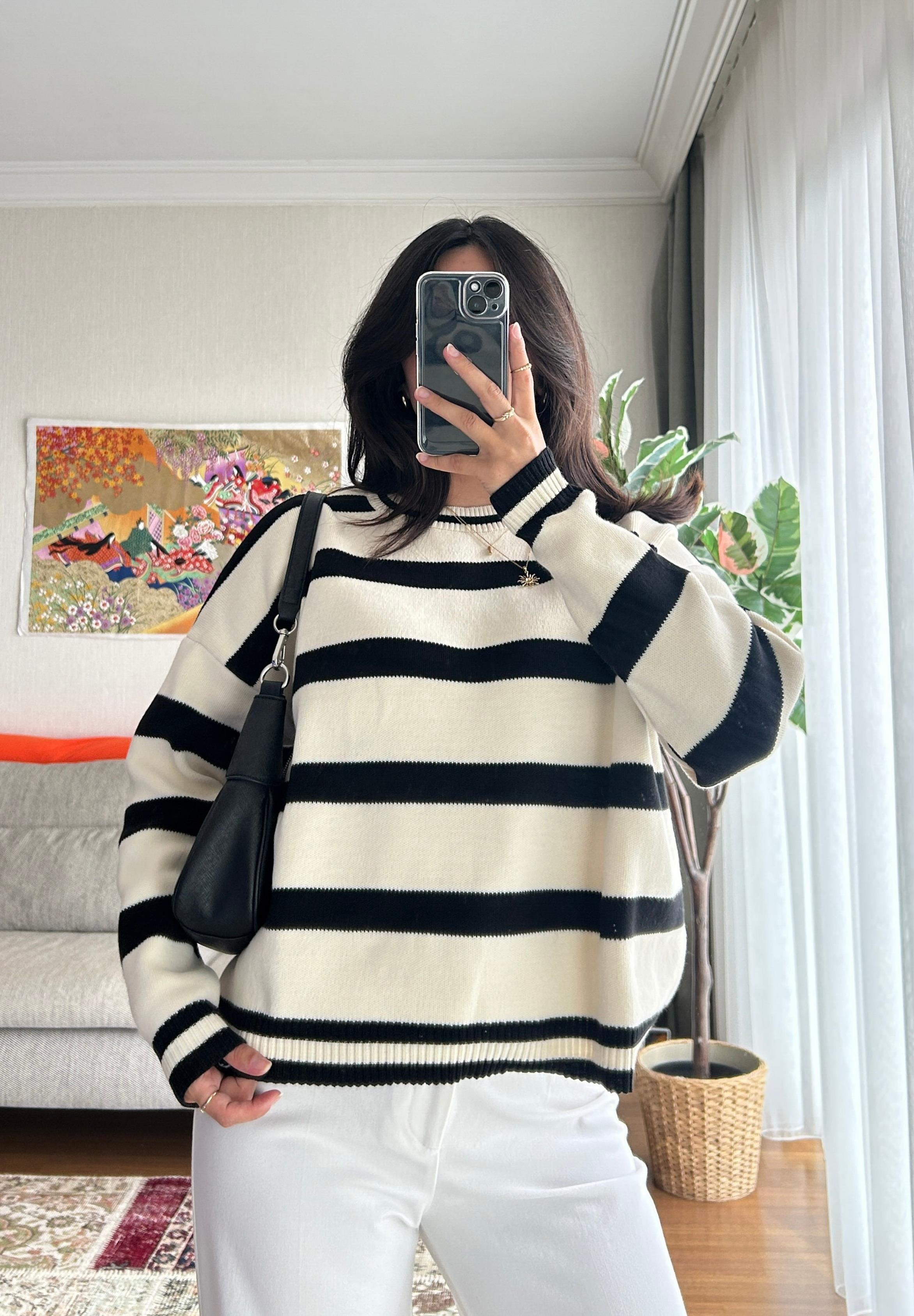 Yuuka Çizgili Triko Kazak Bej-Siyah