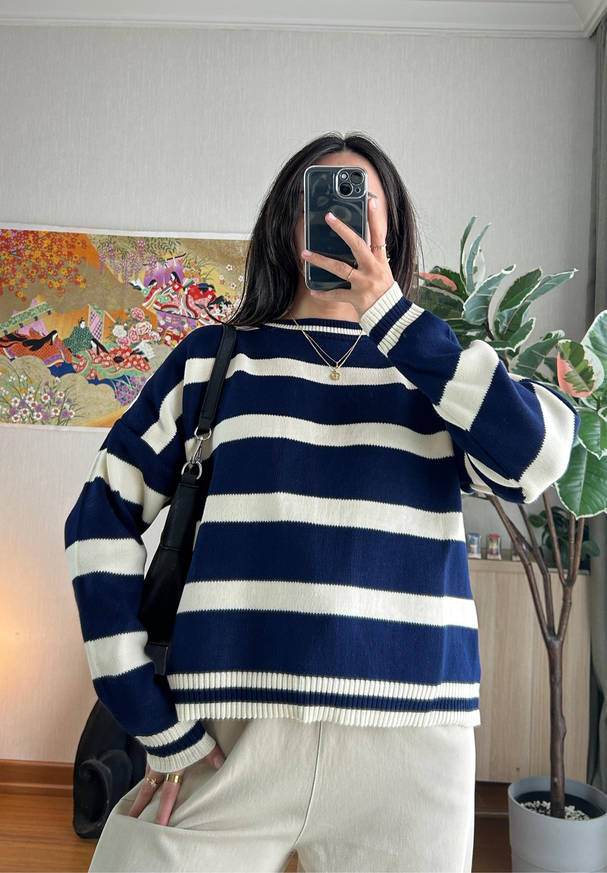 Yuuka Çizgili Triko Kazak Lacivert-Beyaz